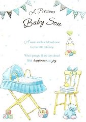 Baby Boy Greetings A Precious Baby Son Range: Chantilly Item Number: 246014 Approximate Size: 9.75" X 7" Pricing Code: 125 Click on card for Enlarged Image. |