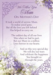 We Miss You Mum On Mothers Day Range: Item Number: 13352002 Approximate Size: 6" X 4" Pricing Code: 30/EE Click on card for Enlarged Image. |