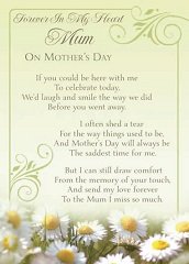 Mothers Day Card Forever In My Heart Mum On Mothers Day Range: Item Number: 13352003 Approximate Size: 6" X 4" Pricing Code: 30/EE Click on card for Enlarged Image. |