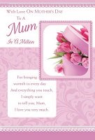 To A Mum In A Million Range: Item Number: 658014 Approximate Size: 9" X 6" Pricing Code: 75/JJ Click on card for Enlarged Image. |