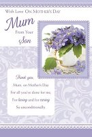 With Love On Mothers Day Mum For Son Range: Item Number: 658018 Approximate Size: 9" X 6" Pricing Code: 75/JJ Click on card for Enlarged Image. |