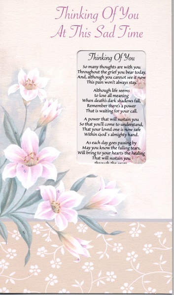 Thinking Of You At This Difficult Time Range: Inspirational Keepsakes Item Number: 194013 Approximate Size: 8" X 4.75" Pricing Code: 070 Click on card for Enlarged Image. |