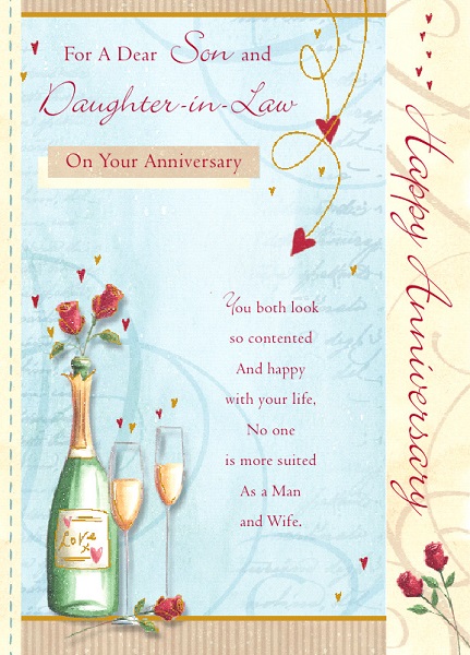 To a Special Son and daughter in Law On Your Wedding Anniversary Range: Sentiments Item Number: 490104 Approximate Size: 9" X 6" Pricing Code: 075 Click on card for Enlarged Image. |